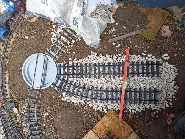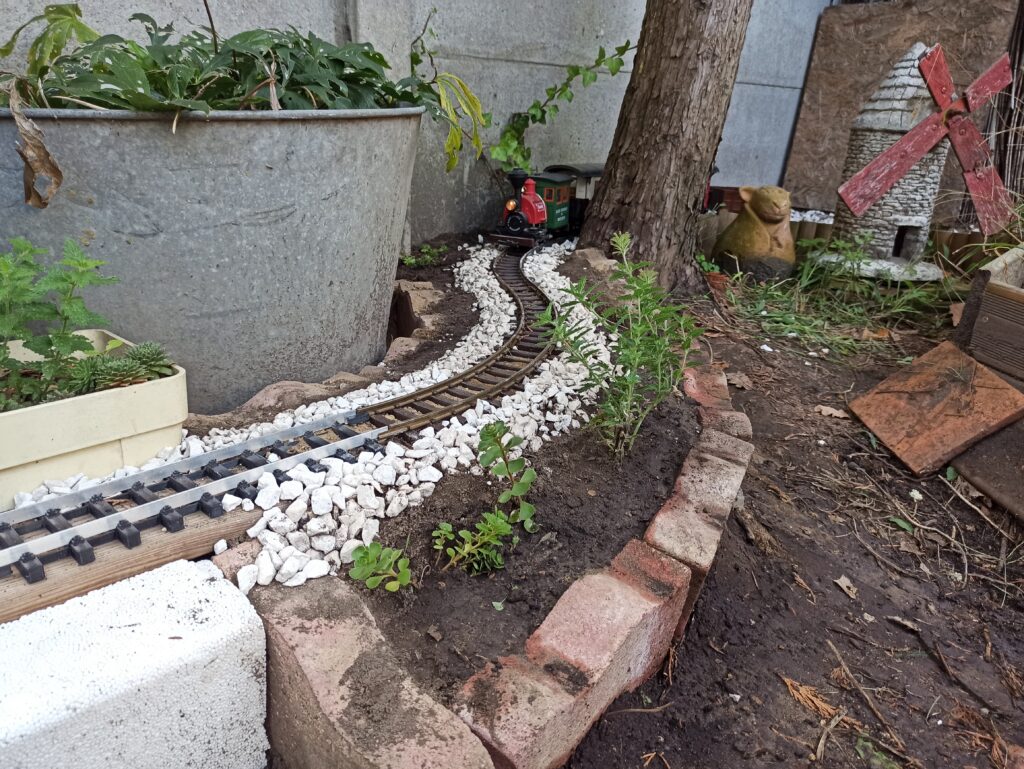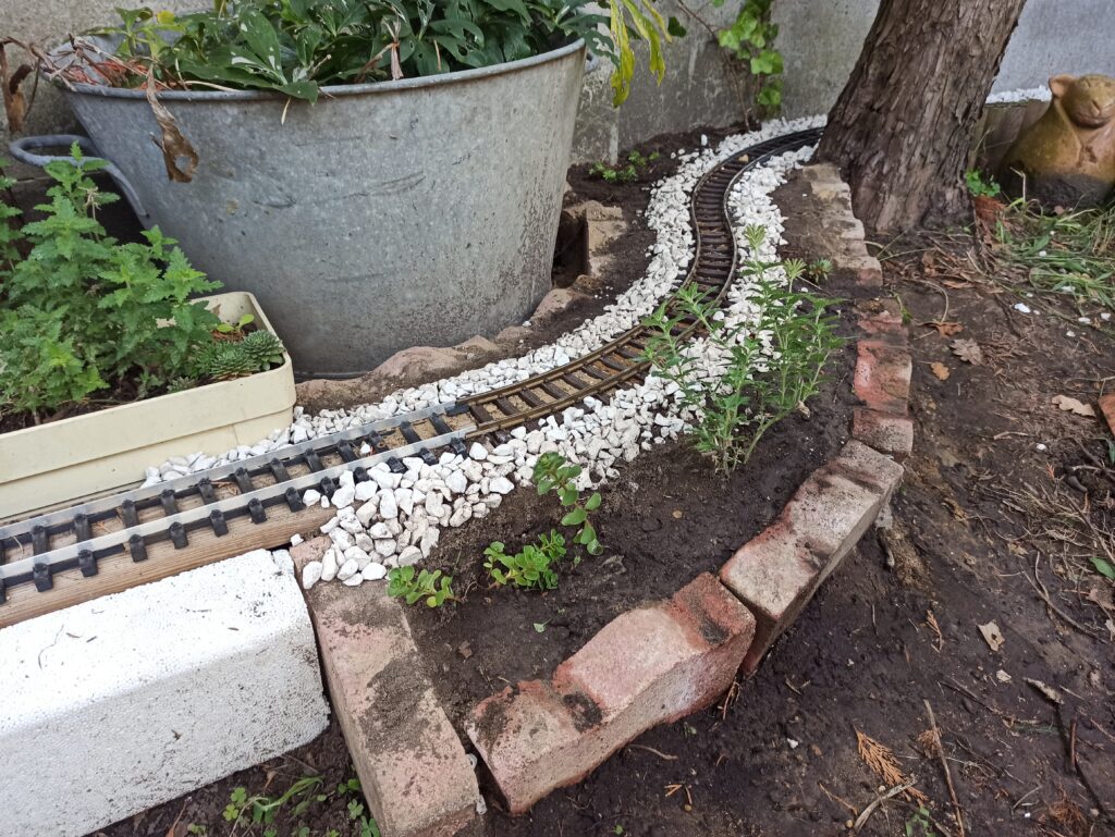 Première étape j’ai aménagé autour du premier S de l’extension. Pour cela j’ai utilisé des pavés auto-blocants de récupération pour soutenir la terre que j’ai ajoutée en bordure de voie. J’ai aussi replanté des plantes grasses en espérant qu’elle repartent. Un peu de gravillons blancs pour faire le ballast.