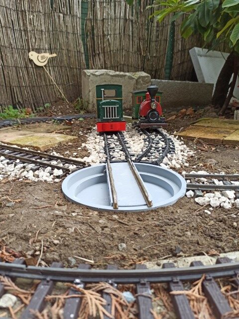 J’ai ensuite creusé un peu à l’emplacement du pont tournant afin qu’il s’intègre parfaitement de niveau dans le réseau. J’ai aussi percé 2 trous pour faciliter l’évacuation de l’eau de pluie :